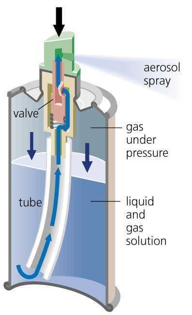 In spraying process the liquid is pushed out the can through a nuzzle due to the pressure of propellant gas.
